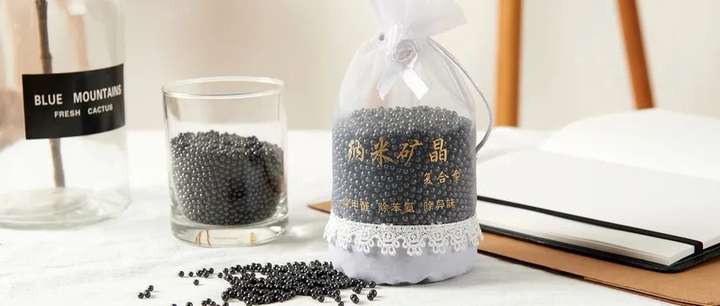 这款除甲醛产品是程女士在网上,综合网页的评价、推荐来挑选的——一款吸附甲醛后表面变黄的固体豆子。